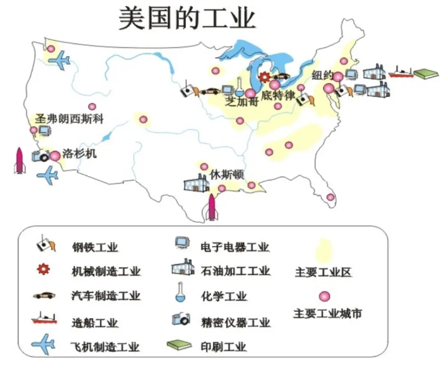 西部工业区 | 二战后兴起,资源丰富的“阳光地带”,航空、石油、电子 | 洛杉矶:最大飞机制造中心,航天、电子、石油、电影;圣弗朗西斯科:港口、电子石油、农产品加工、华人集中,硅谷 |